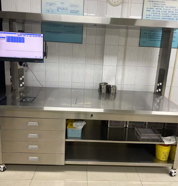 全不锈钢304材质,具有横梁架,横梁架带LED光源照明,四抽屉,多层台面,可选配自由调节电脑支架、电源接口、RJ45网络接口、高清