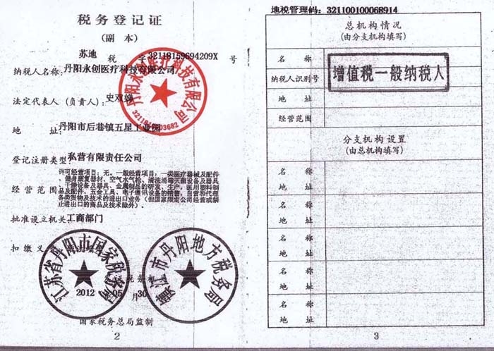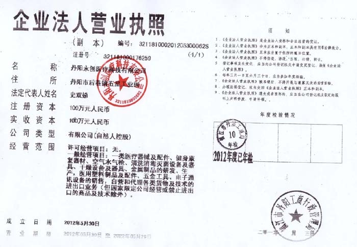 丹阳永创医疗科技有限公司 地址:江苏省丹阳市后巷镇五星工业园大海路1号 邮编:212312